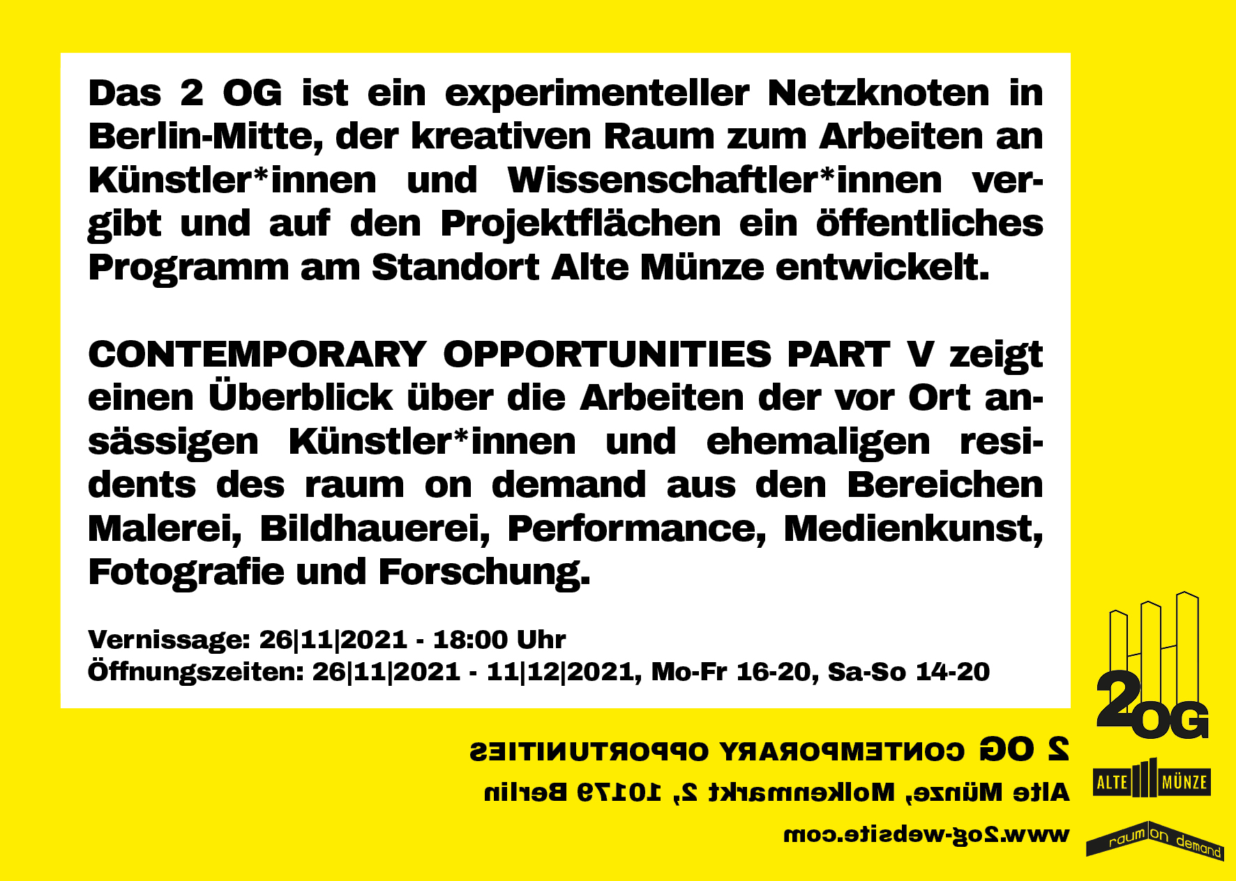 Es freut mich sehr, erneut die Möglichkeit zu haben, in der Alten Münze auszustellen. Dieses Mal als Teil der CONTEMPORARY OPPORTUNITIES V.