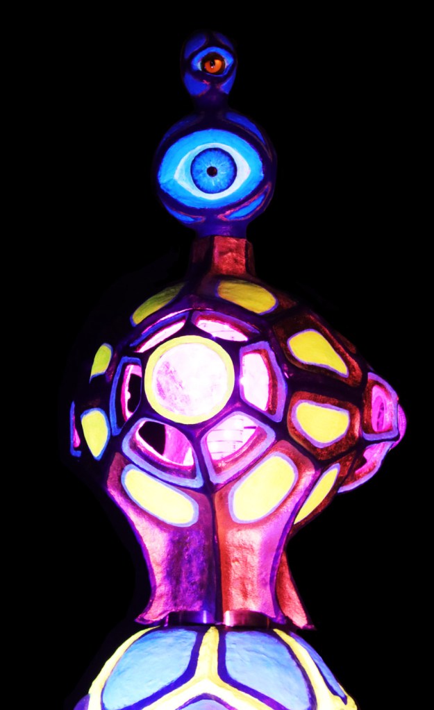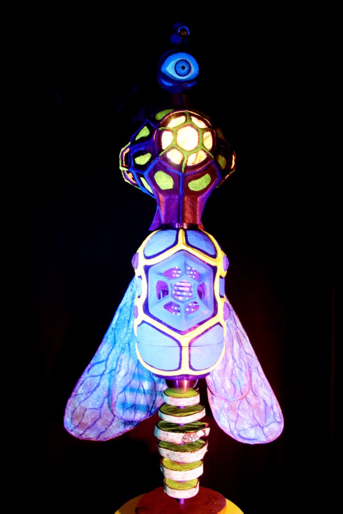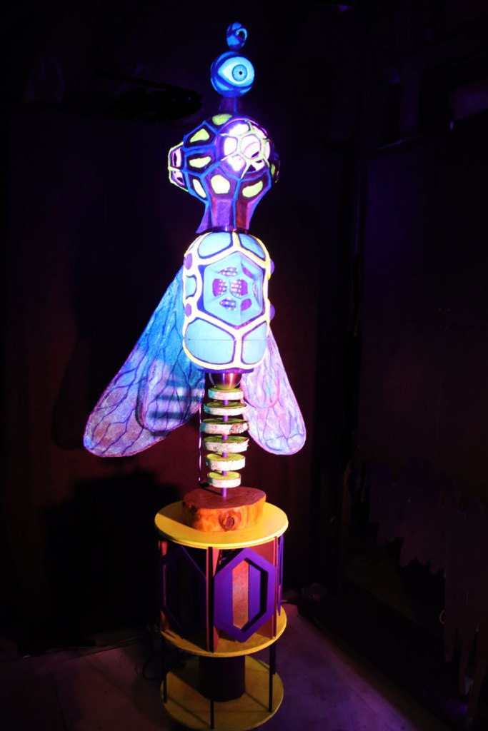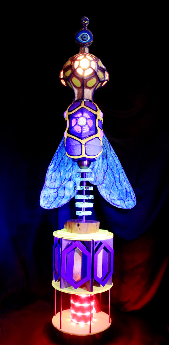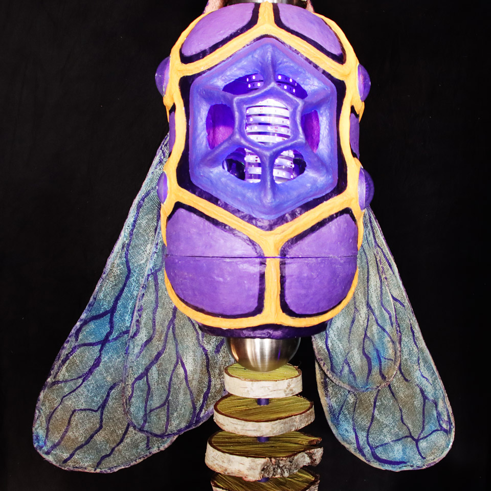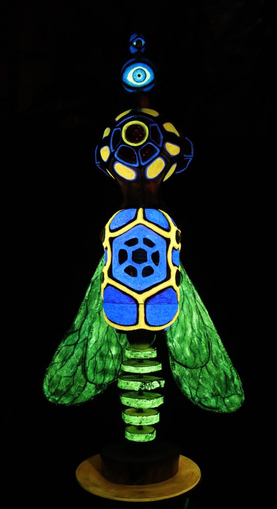 “The Bee Who Didn’t Wanna Be What She Was Supposed To Be”oder „Die Biene, die nicht werden wollte, was sie werden sollte“ ist der ziemlich lange Titel dieser Arbeit. Eigentlich war dieses Bienen-Auge als Wildbienen-Nisthilfe geplant, doch sie weigerte sich vehement, draussen innerhalb kürzester Zeit zu verwittern. So beriet ich mich mit Steffen, der mir beim Aufbau half, was sie werden könnte. Wir probierten die Bestückung mit Lautsprechern, die so gut klang, dass sie fest installiert wurde. Nun ist die Biene ein Licht- und Soundobjekt, welches mit 6 Lautsprechern einen Surround-Sound produziert, der sich hören lassen kann.