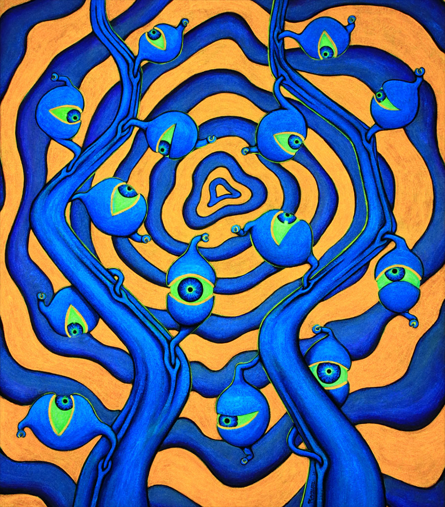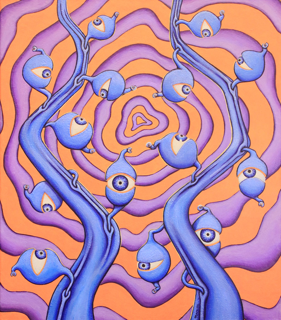 Dieses Bild hat einige Jahre bis zur Fertigstellung benötigt. Diese blaue Version der floralen Augen war schon 2012 da, aber ich war noch nicht zufrieden mit dem einfach orangenem Hintergrund. Und so wartete es 12 Jahre, bis ich die violette Struktur hinzufügte, um dem Bild mehr Tiefe zu geben.