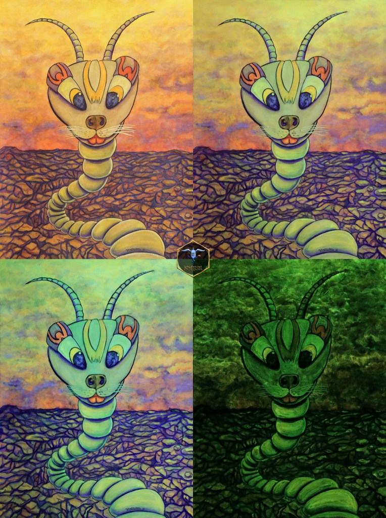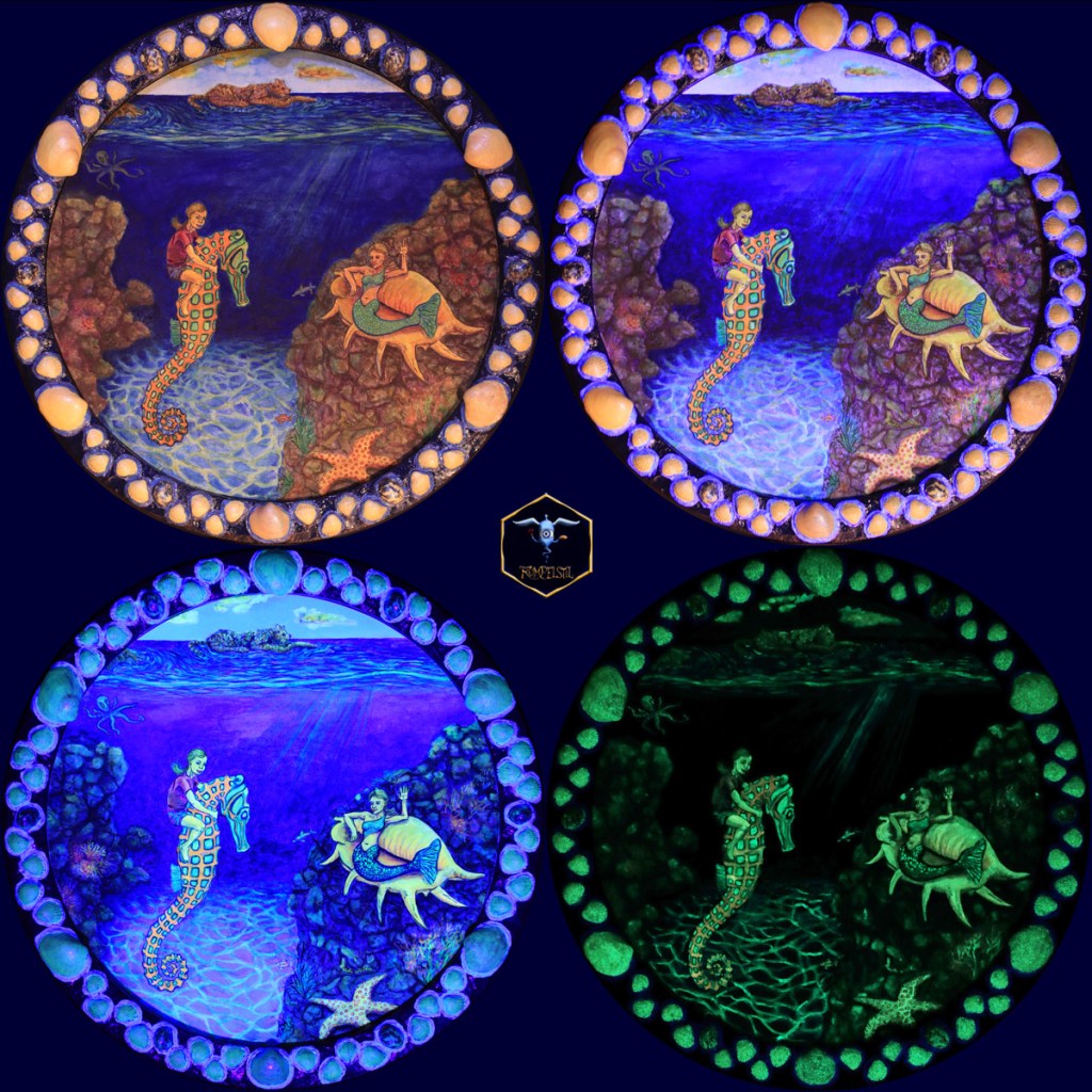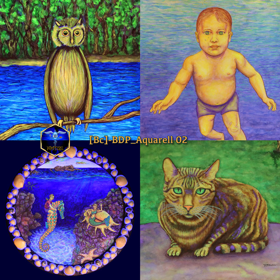 Tech-InjectionPoetic LinesThe Worm[Bc-06]-Jola’s Seepferd-Ritt Aquarell auf 425 g/m2-Papier Muschelrahmen, ø30 cm 2021Tech-Head[Bc-02]_01-Caruso Aquarell auf papier 24 x 32 cm 2021/22[Bc-01]_02-Jola Diving Aquarell auf papier 26 x 48 cm 2022[Bc-02]-02_Eule am See